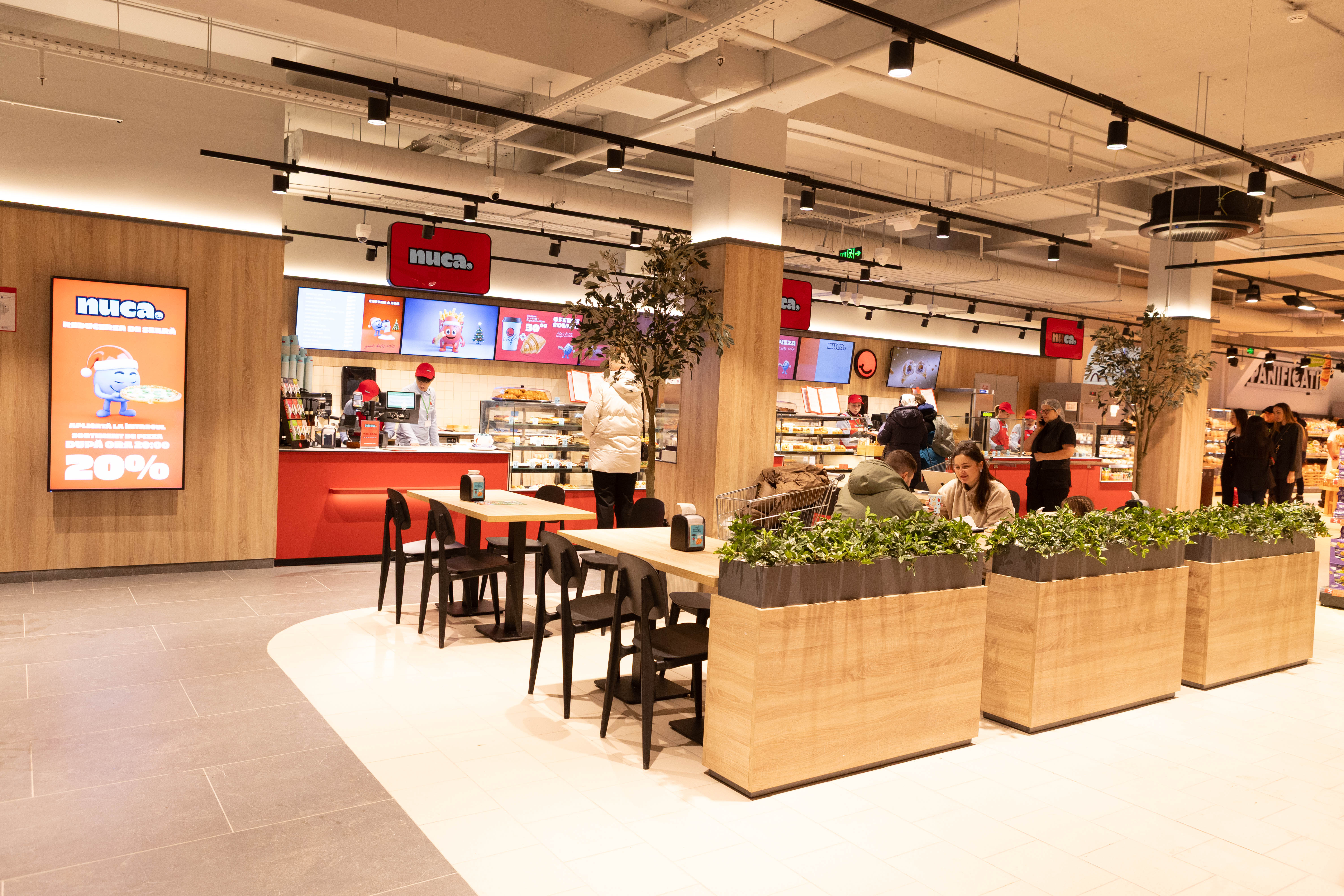 În zona CAFÉ NUCA, aromele te opresc din drum: pizza proaspăt coaptă, salate fresh, bucate apetisante și multe alte bunătăți pregătite cu pasiune. Un colț primitor, perfect pentru o pauză savuroasă între cumpărături.
